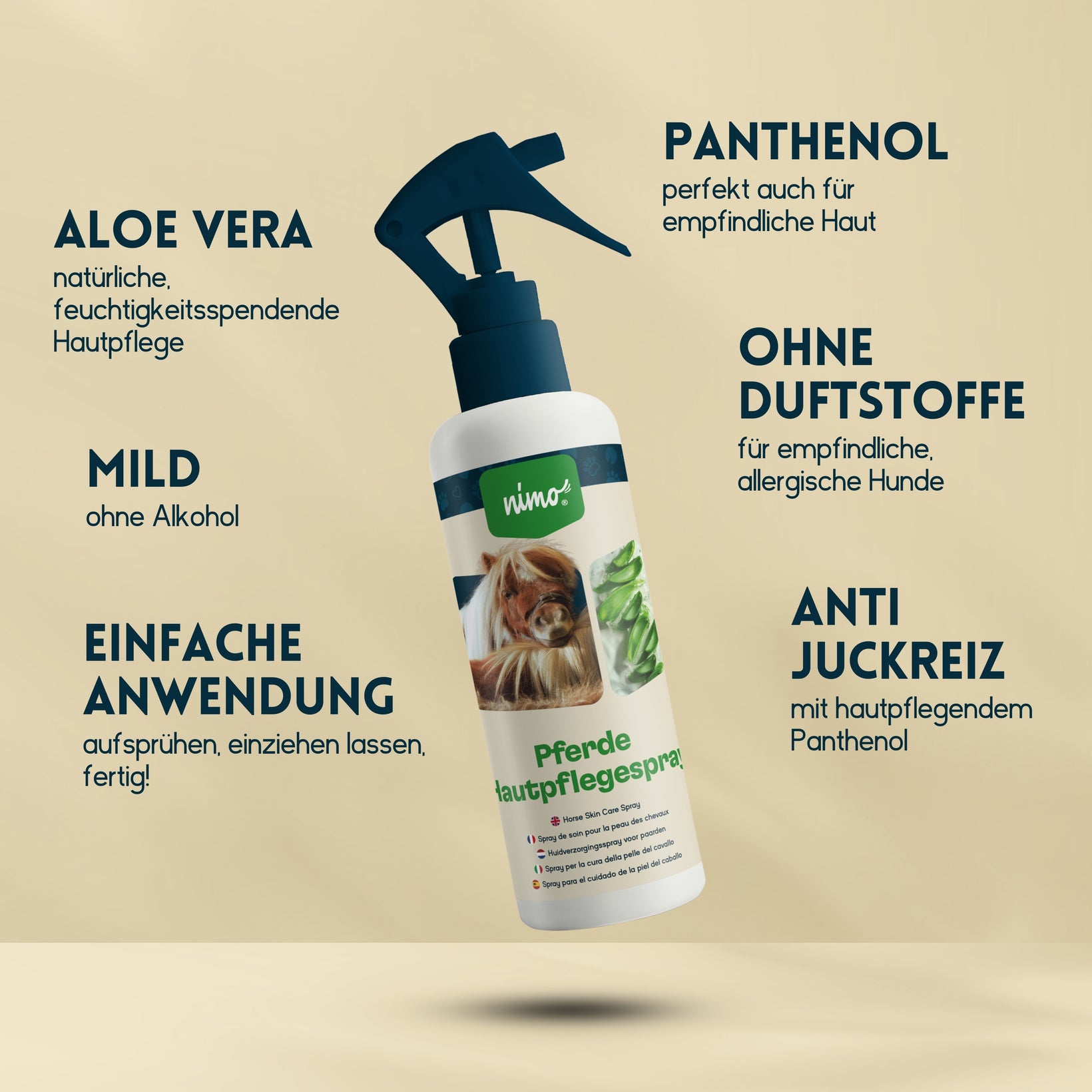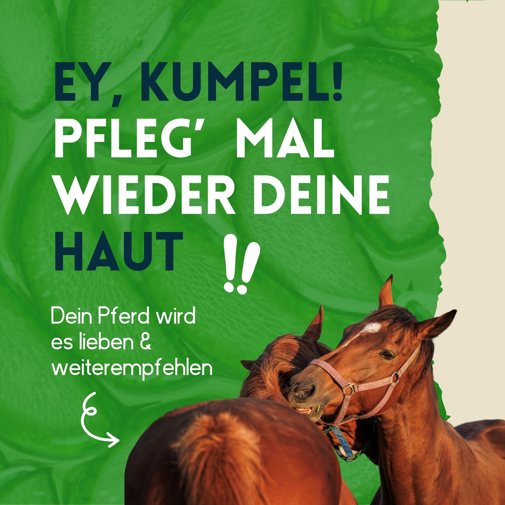 Sanfte Hautpflege für Dein Pferd: Sanftes und effektives Pflegespray für die Haut Deines Pferdes auf Basis von Aloe Vera und Panthenol zur Förderung des Regenerationsprozesses bei Entzündungen, Irritationen und kahlen Stellen. Aloe Vera wirkt beruhigend und hydratisierend bei juckender und gereizter Haut. Das Panthenol unterstützt die Heilung von beanspruchter sowie von Ungeziefer befallener Haut.